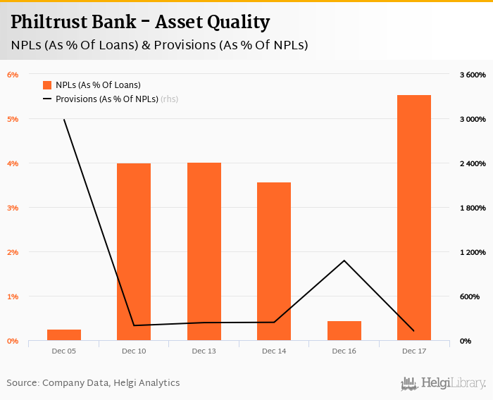 Philtrust Bank's non-performing loans reached 5.53% of total loans at the end of 2017-12-31, up from 0.451% compared to the previous year. Historically, the NPL ratio hit an all time high of 5.53% in 2017-12-31 and an all time low of 0.261% in 2005-12-31.