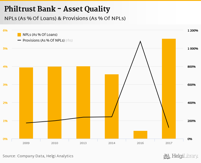 Philtrust Bank's non-performing loans reached 5.53% of total loans at the end of 2017, up from 0.451% compared to the previous year. Historically, the NPL ratio hit an all time high of 5.53% in 2017 and an all time low of 0.451% in 2016.
