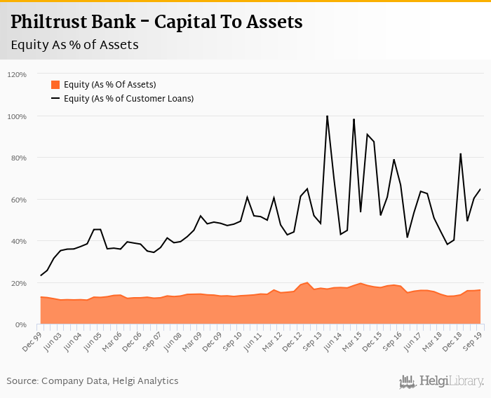 Philtrust Bank's Equity reached 16.2% of total assets in the 3Q2019, up from 13.3% for the previous year. As a share of net customer loans, the ratio amounted to 64.7% at the end of the third quarter of 2019.