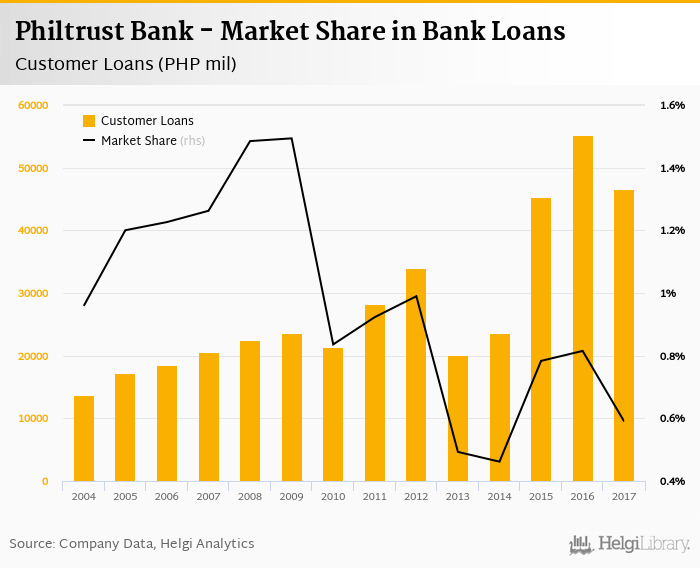 Philtrust Bank's customer loans reached PHP 46,675 mil in 2017, down 15.4% compared to the previous year.