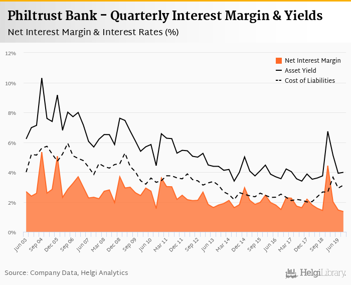 Philtrust Bank's net interest margin amounted to 1.36% in the third quarter of 2019, down from 1.46% when compared to the previous quarter.