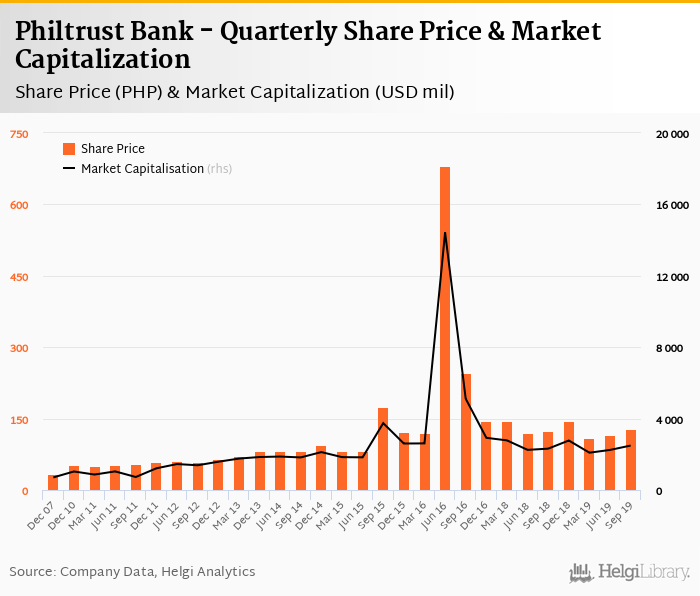 Philtrust Bank stock traded at PHP 129 per share at the end of third quarter of 2019 implying a market capitalization of USD 2,490 mil.