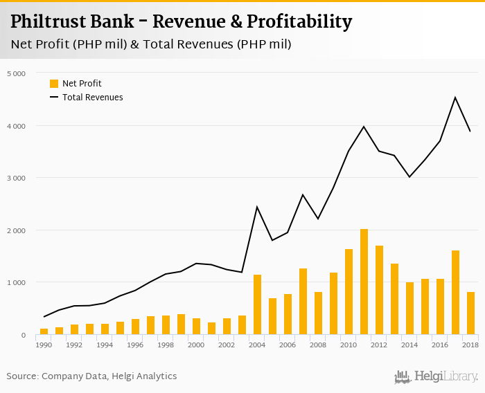 Philtrust Bank made a net profit of PHP 824 mil under revenues of PHP 3,870 mil in 2018, up -48.9% and -14.4% respectively compared to the previous year.