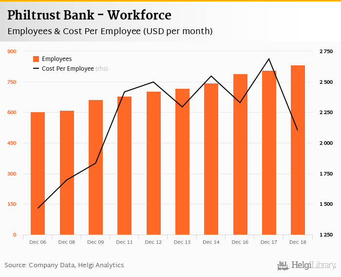 Philtrust Bank employed 832 persons in 2018-12-31, down 0% when compared to the previous year. Historically, the bank's workforce hit an all time high of 832 persons in 2018-12-31 and an all time low of 602 in 2006-12-31.