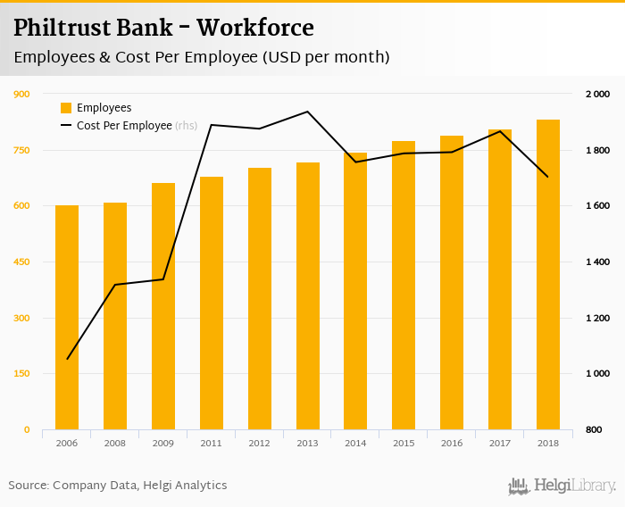 Philtrust Bank employed 832 persons in 2018, up 3.10% when compared to the previous year. Historically, the bank's workforce hit an all time high of 832 persons in 2018 and an all time low of 602 in 2006.