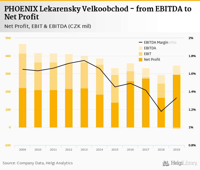 PHOENIX Lekarensky Velkoobchod made a net profit of CZK 296 mil with revenues of CZK 25,613 mil in 2019, up by 77.9% and up by 2.42%, respectively, compared to the previous year. This translates into a net margin of 1.16%.