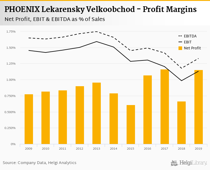 PHOENIX Lekarensky Velkoobchod made a net profit of CZK 296 mil with revenues of CZK 25,613 mil in 2019, up by 77.9% and up by 2.42%, respectively, compared to the previous year.