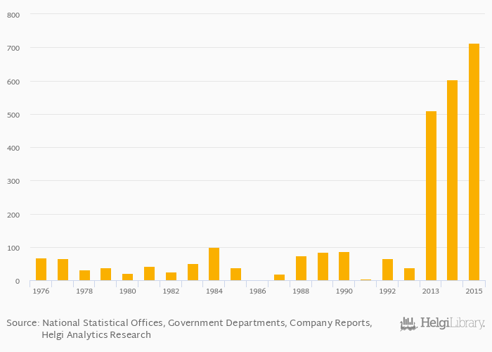 Historically, phosphate rock production in Turkey reached an all time high of 713 kt in 2015 and an all time low of 2.70 kt in 1986.