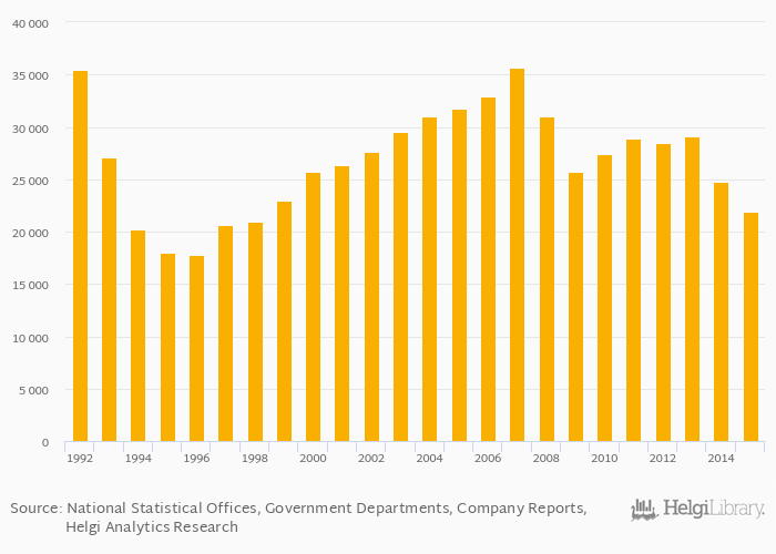 Historically, pig iron production in Ukraine reached an all time high of 35,650 kt in 2007 and an all time low of 17,800 kt in 1996. When compared to Ukraine's main peers, pig iron production in Poland amounted to 4,826 kt, 1,800 kt in Romania and 53,700 kt in Russia in 2015.