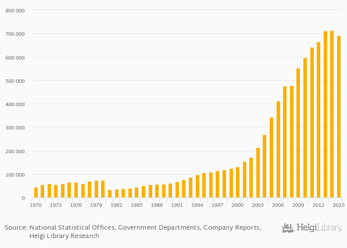 Historically, pig iron production in China reached an all time high of 713,748 kt in 2014 and an all time low of 34,170 kt in 1981. When compared to China's main peers, pig iron production in India amounted to 74,621 kt, 81,011 kt in Japan, 53,700 kt in Russia and 26,000 kt in USA in 2015.