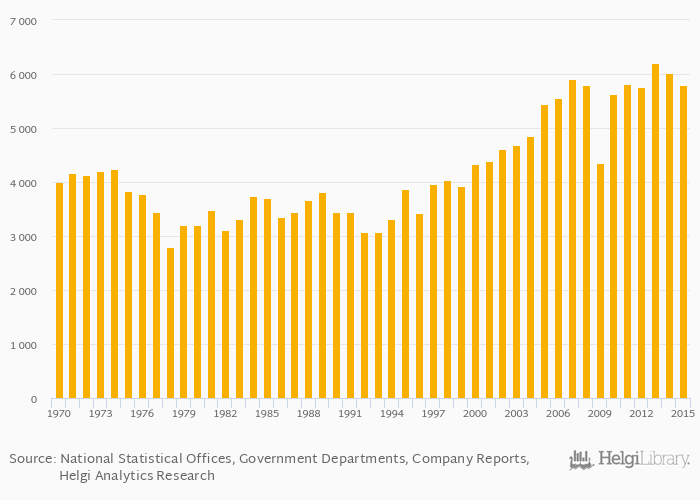 Historically, pig iron production in Austria reached an all time high of 6,200 kt in 2013 and an all time low of 2,788 kt in 1978.