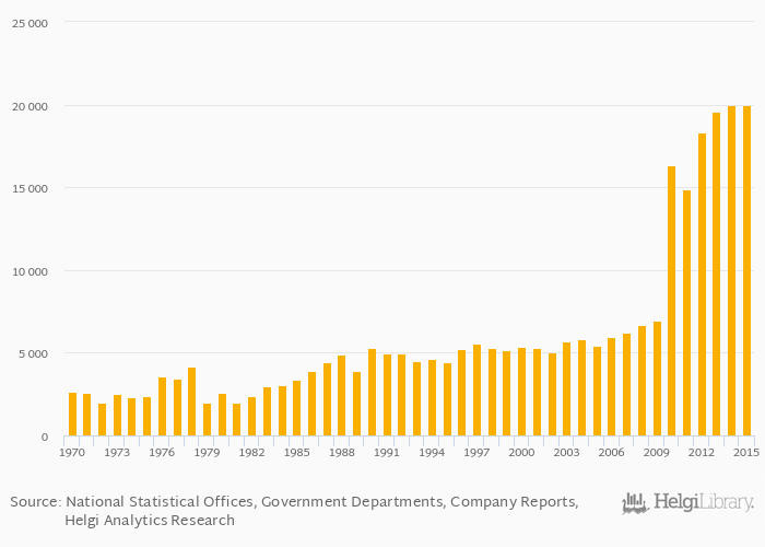 Historically, pig iron production in Turkey reached an all time high of 20,000 kt in 2015 and an all time low of 1,954 kt in 1981.