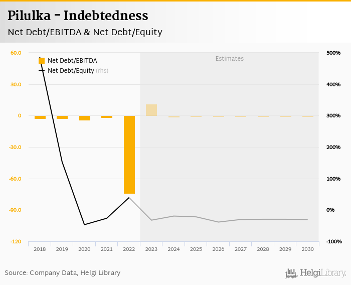Pilulka's net debt stood at CZK 54.9 mil and accounted for 39.2% of equity at the end of 2022. The ratio is up 65.7 pp compared to the previous year.