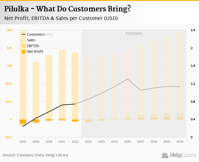 In 2022, Pilulka served a total of 0.743 mil customers, up 74.8% when compared to 3 years ago. A simple comparison of Pilulka's sales with a number of its customers reveals that the average customer brought the firm USD 151 revenue in 2022. In terms of profitability, a single client generated EBITDA of USD -0.046 and a net profit of USD -4.03 in 2022.