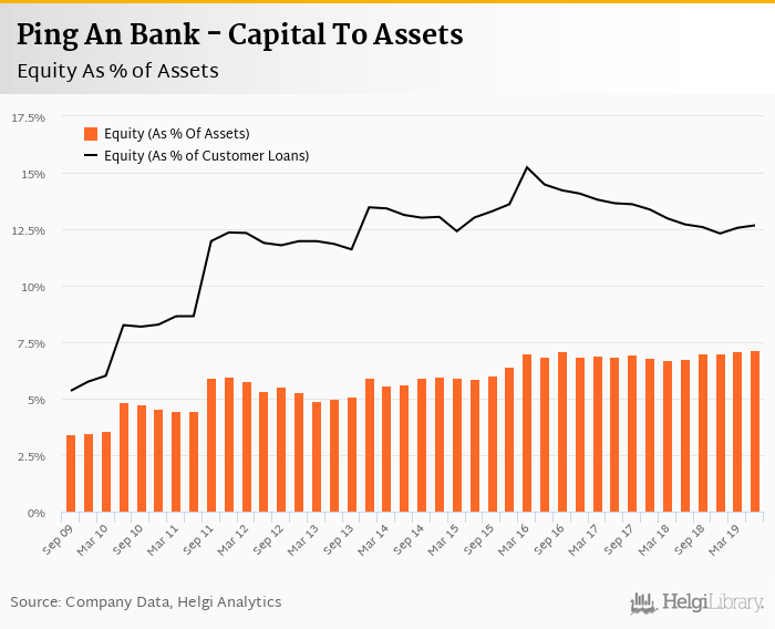 Ping An Bank's Equity reached 4.91% of total assets in the 2Q2019, up from 4.86% for the previous year. As a share of net customer loans, the ratio amounted to 10.9% at the end of the second quarter of 2019.