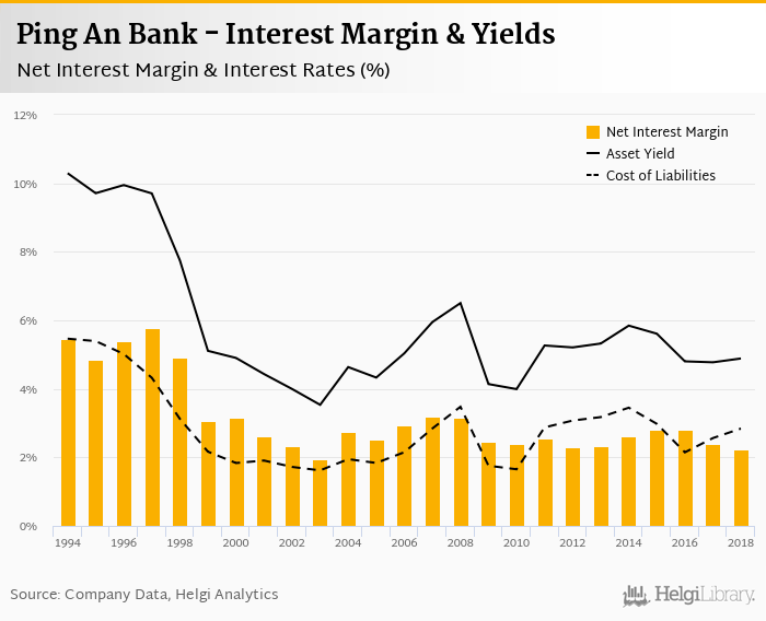 Comparing Ping An Bank with its closest peers, Home Credit China operated in 2018 with a net interest margin of 17.2% in 2018, Qudian reached 15.7% and Lexin FinTech some 13.6%.