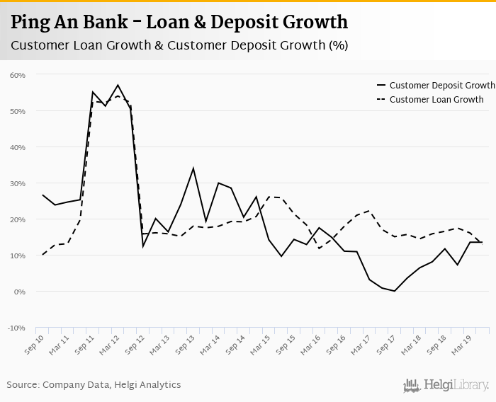 Ping An Bank's customer loan growth reached 12.9% in 2019-06-30, down from 15.8% compared to the previous year. Historically, the bank’s loans growth reached an all time high of 54.0% in 2012-03-31 and an all time low of 10.0% in 2010-09-30. In the last decade, the average annual loan growth amounted to 0%.