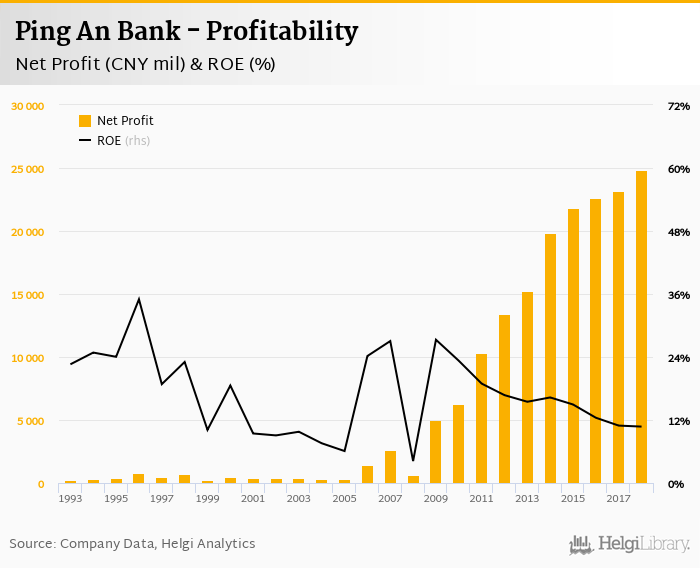 Ping An Bank made a net profit of CNY 24,818 mil in 2018, up 7.02% compared to the previous year. This implies a return on equity of 10.7%.