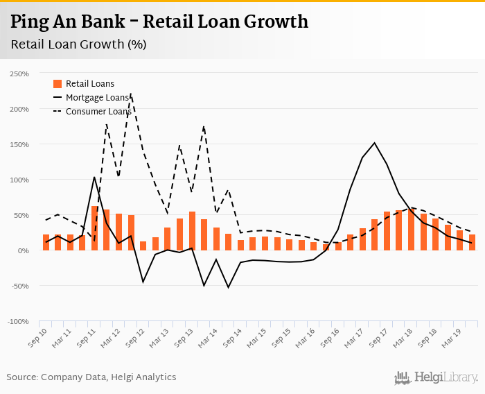 Ping An Bank's retail loans reached CNY 1,224,910 mil at the end of 2019-06-30, up 2.89% compared to the previous year. In the last decade, the average annual loan growth amounted to 0%.