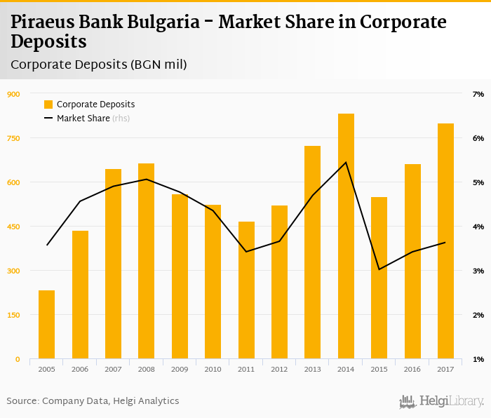 Piraeus Bank Bulgaria accounted for 3.63% of all corporate deposits taken by banks in Bulgaria at the end of 2017. Historically, the bank’s market share in corporate deposits reached an all time high of 5.43% in 2014 and an all time low of 3.01% in 2015.