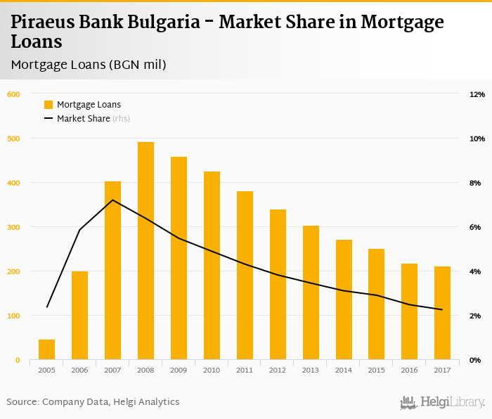 Piraeus Bank Bulgaria accounted for 2.24% of all mortgage loans issued in Bulgaria at the end of 2017. Historically, the bank’s market share in mortgage loans reached an all time high of 7.19% in 2007 and an all time low of 2.24% in 2017.