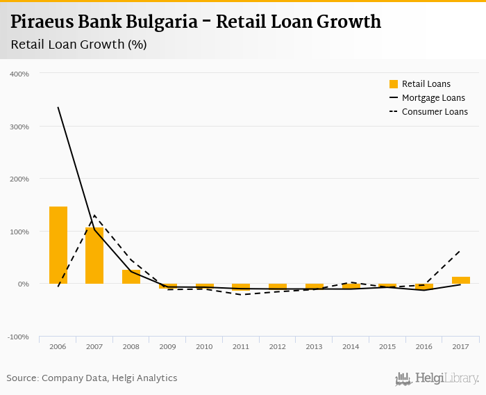 Piraeus Bank Bulgaria's retail loans reached BGN 328 mil at the end of 2017, up 13.8% compared to the previous year. In the last decade, the average annual loan growth amounted to -4.56%.