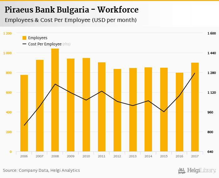 Piraeus Bank Bulgaria employed 902 persons in 2017, up 12.8% when compared to the previous year. Historically, the bank's workforce hit an all time high of 1,046 persons in 2008 and an all time low of 777 in 2006.