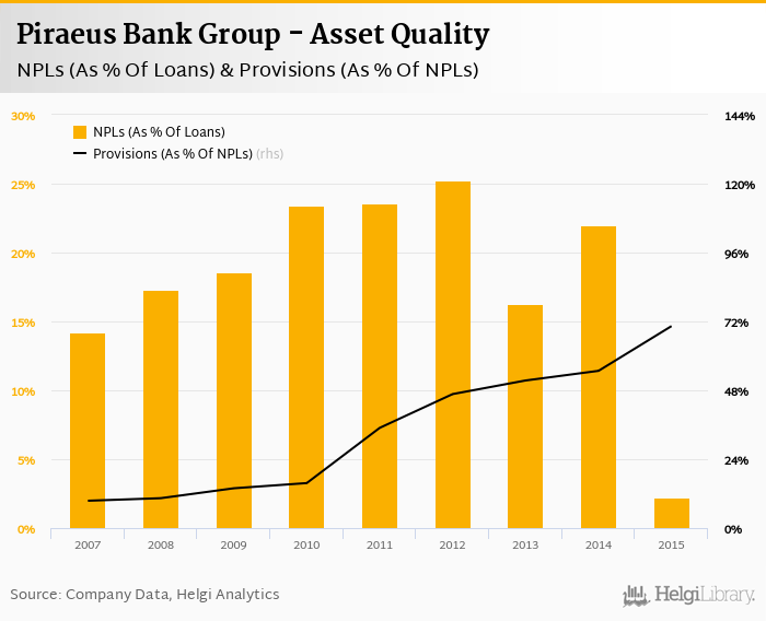 Comparing Piraeus Bank Group with its closest peers, National Bank of Greece operated at the end of 2015 with NPL ratio of 37.9% and provision coverage of 58.2%, Alpha Bank Group with 53.7% and 38.4% respectively and Eurobank Group had 43.4% of bad loans covered with 52.6% by provisions at the end of 2015.
