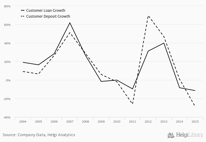 On the other hand, bank's customer deposit growth amounted to -28.8% at the end of 2015, down from 0.836% when compared to the previous year. Historically, the bank’s deposit growth reached an all time high of 69.6% in 2012 and an all time low of -28.8% in 2015. In the last decade, the average annual loan growth amounted to 12.9%.