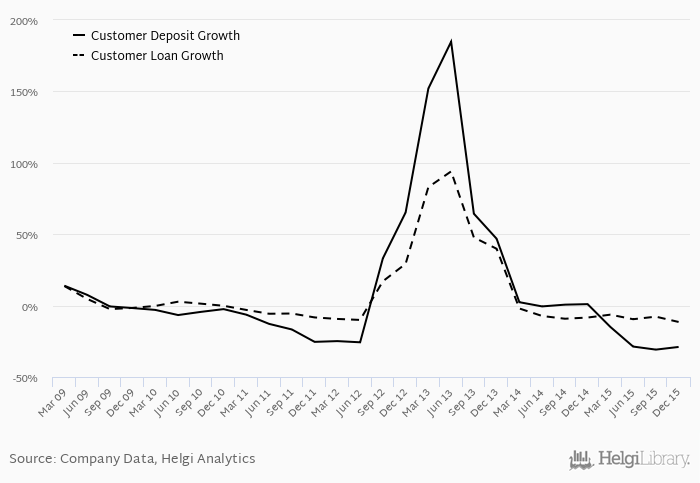 On the other hand, bank's customer deposit growth amounted to -29.0% at the end of 2015-12-31, down from 1.02% when compared to the previous year. Historically, the bank’s deposit growth reached an all time high of 185% in 2013-06-30 and an all time low of -30.8% in 2015-09-30. In the last decade, the average annual loan growth amounted to 0%.