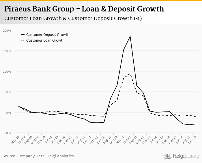 Piraeus Bank Group's customer loan growth reached -11.5% in 2015-12-31, down from -8.37% compared to the previous year. Historically, the bank’s loans growth reached an all time high of 94.0% in 2013-06-30 and an all time low of -11.5% in 2015-12-31. In the last decade, the average annual loan growth amounted to 0%.