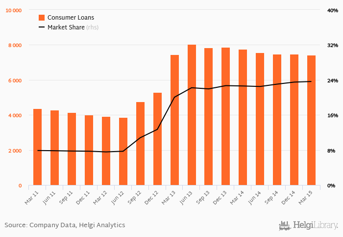 Piraeus Bank Group's consumer loans reached EUR 7,410 mil in 2015-03-31, down 0.730% compared to the previous year.