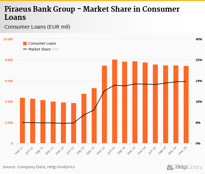 Piraeus Bank Group accounted for 23.6% of all consumer loans issued in Greece at the end of 2015-03-31. Historically, the bank’s market share in consumer loans reached an all time high of 23.6% in 2015-03-31 and an all time low of 7.55% in 2012-03-31.