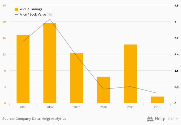 In terms of price to book value, the stock reached 0.481x at the end of 2013. Since 2008, the multiple reached an all time high of 4.12x in 2006 and an all time low of 0.481x in 2013 with an average of 1.68x.