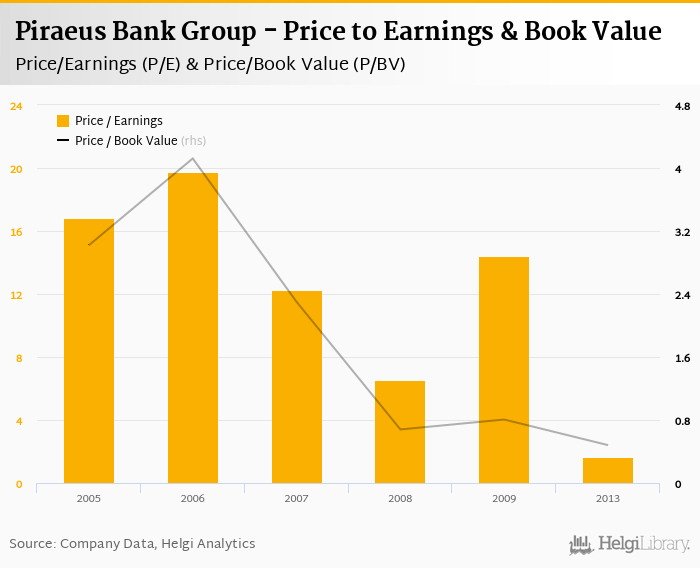 At the end of 2013, the bank traded at price to earnings of 1.62x. Within the last five years, the multiple reached an all time high of 19.7x in 2006 and an all time low of 1.62x in 2013 with an average of 10.9x.