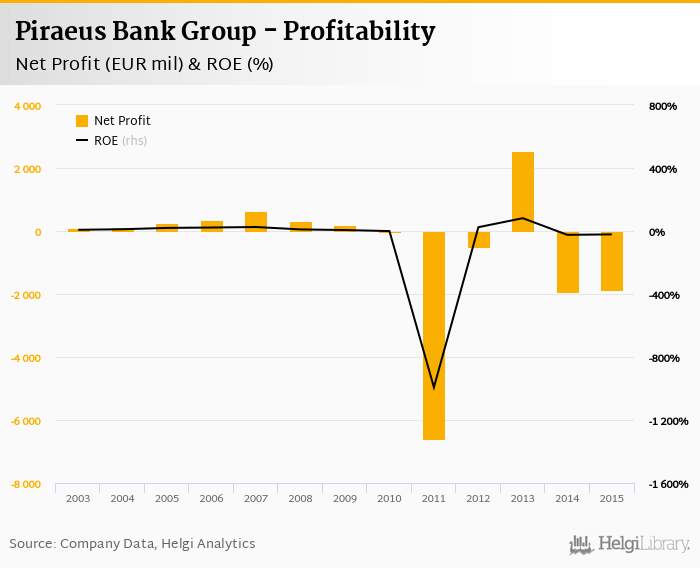 Comparing Piraeus Bank Group with its closest peers, National Bank of Greece generated a net profit of EUR -4,227 mil with ROE of -41.7% in 2015, Alpha Bank Group netted EUR -1,372 mil (ROE of -16.4%) and Eurobank Group announced a net profit of EUR -1,076 mil implying ROE of -16.0%.