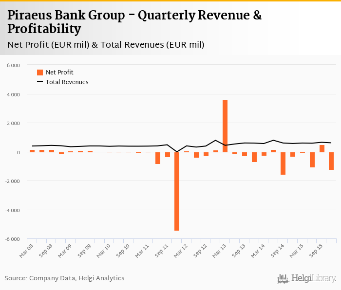 When compared to bank's main peers, National Bank of Greece generated a quarterly net profit of EUR -2,050 mil with revenues of EUR 524 mil in 4Q2015, Alpha Bank Group netted EUR -622 mil (revenues of EUR 636 mil) and Eurobank Group announced a net profit of EUR -175 mil (revenues of EUR 479 mil).