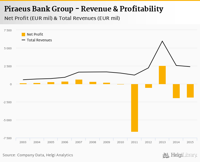 Comparing Piraeus Bank Group with its closest peers, National Bank of Greece generated a net profit of EUR -4,227 mil with revenues of EUR 2,089 mil in 2015, Alpha Bank Group netted EUR -1,372 mil (revenues of EUR 2,313 mil) and Eurobank Group announced a net profit of EUR -1,076 mil (revenues of EUR 1,762 mil).