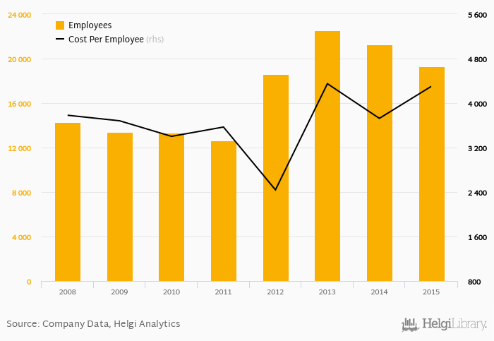 Piraeus Bank Group employed 19,279 persons in 2015, down 9.25% when compared to the previous year. Historically, the bank's workforce hit an all time high of 22,509 persons in 2013 and an all time low of 12,648 in 2011.