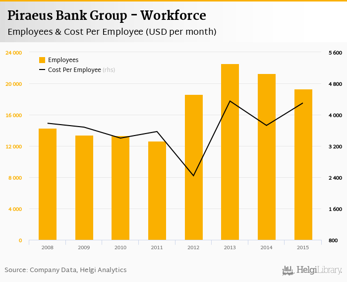 Comparing Piraeus Bank Group with its closest peers, Alpha Bank Group had 13,847 employees and 897 branches in 2015 and Eurobank Group operated with 17,521 people and 962 branches.