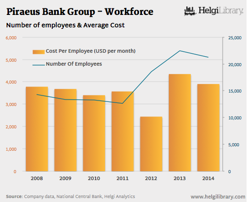 In 2014, the Bank employed 21,243 persons, some 49% more than in 2008. During the same time, however, average staff cost per employee increased 3.2% only, to EUR 3,903 per month.