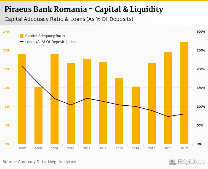 Piraeus Bank Romania's capital adequacy ratio reached 21.8% at the end of 2017, up from 19.6% compared to the previous year. Historically, the bank’s capital ratio hit an all time high of 21.8% in 2017 and an all time low of 12.1% in 2008.