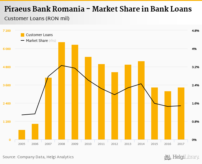 Piraeus Bank Romania accounted for 1.48% of all customer loans issued in Romania at the end of 2017. Historically, the bank’s market share in customer loans reached an all time high of 3.26% in 2008 and an all time low of 1.08% in 2005.