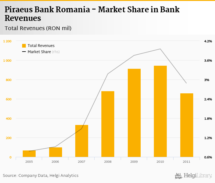 Piraeus Bank Romania generated total banking revenues of RON 660 mil in 2011, down 30.2% compared to the previous year.