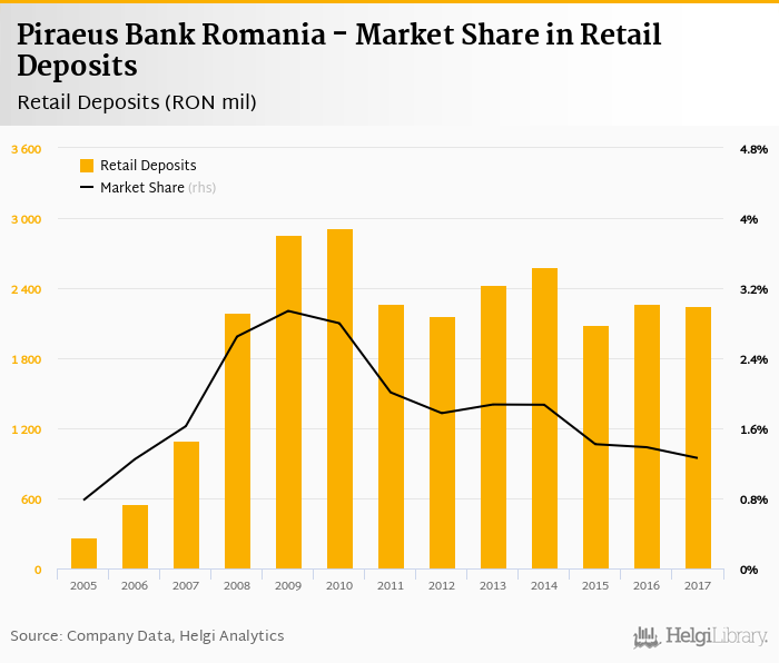 Piraeus Bank Romania's retail deposits reached RON 2,247 mil in 2017, down 0.654% compared to the previous year.
