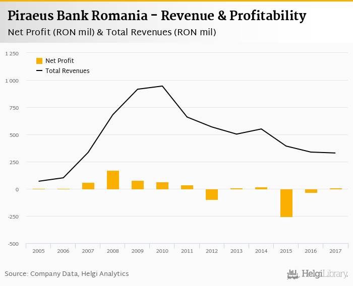 Piraeus Bank Romania made a net profit of RON 10.8 mil under revenues of RON 329 mil in 2017, up 134% and -2.49% respectively compared to the previous year.