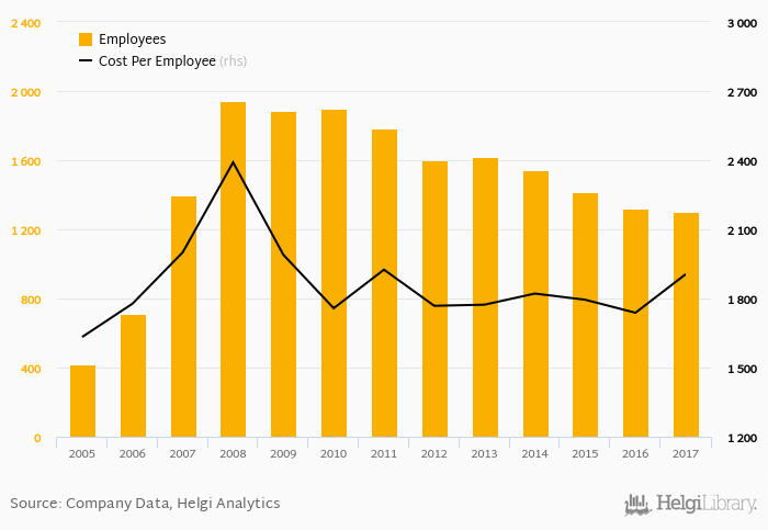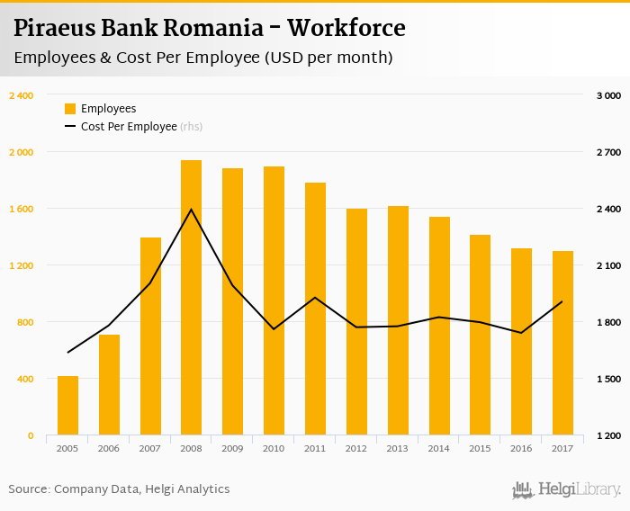 Piraeus Bank Romania employed 1,300 persons in 2017, down 1.66% when compared to the previous year. Historically, the bank's workforce hit an all time high of 1,946 persons in 2008 and an all time low of 417 in 2005.