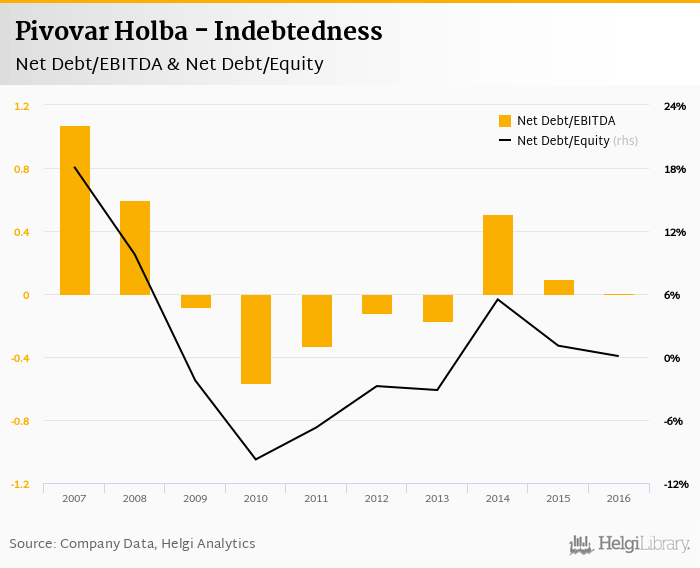 Pivovar Holba's net debt stood at CZK 0.178 mil and accounted for 0.085% of equity at the end of 2016. The ratio is down 0.993 pp compared to the previous year.