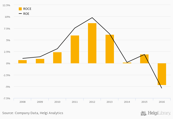 The result implies a return on equity of -5.40% and a return on invested capital of -4.63% in 2016. That is compared to an average of 2.54% and 2.44% over the last five years.