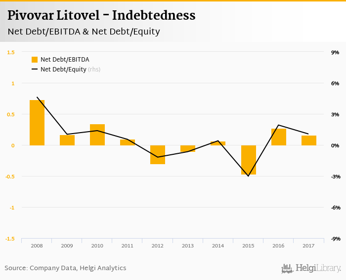 Pivovar Litovel's net debt stood at CZK 8.40 mil and accounted for 1.06% of equity at the end of 2017. The ratio is down 0.866 pp compared to the previous year.